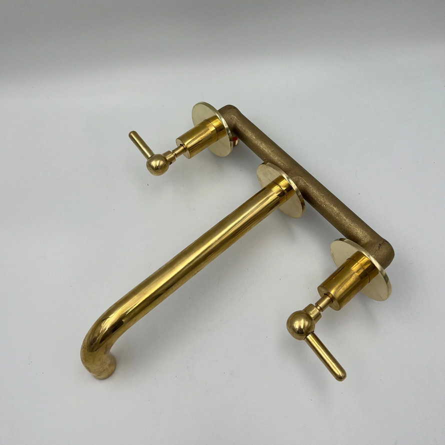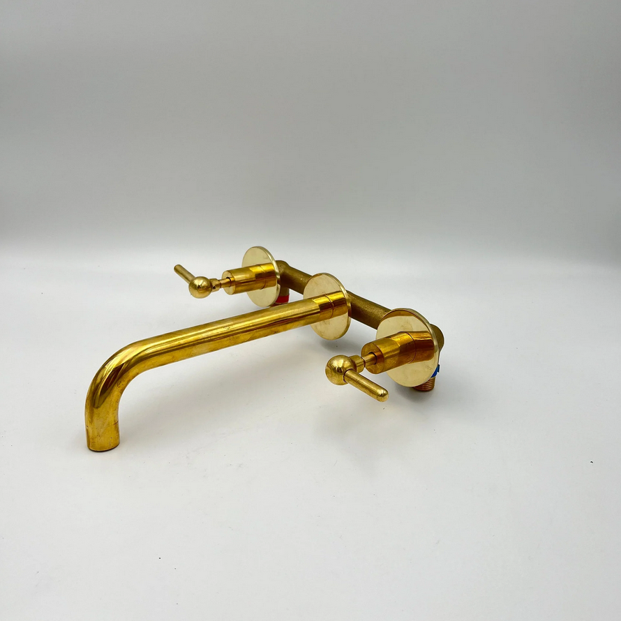 Unlacquered solid brass wall mounted faucet with lever handles – made of solid natural Brass. Perfect for bathroom spaces. works great with bathtub.