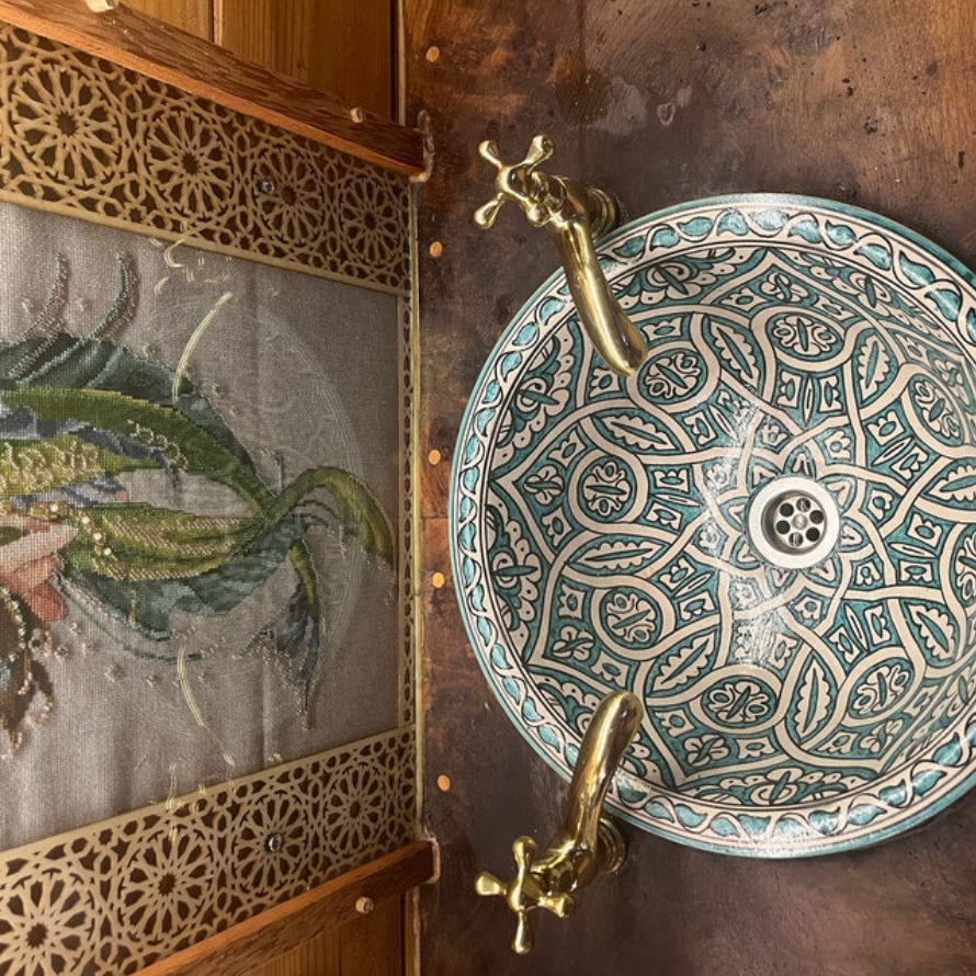 Handmade Single Hole Bathroom Faucet with vintage cross handles. 6 1/2 inches in spout reach.