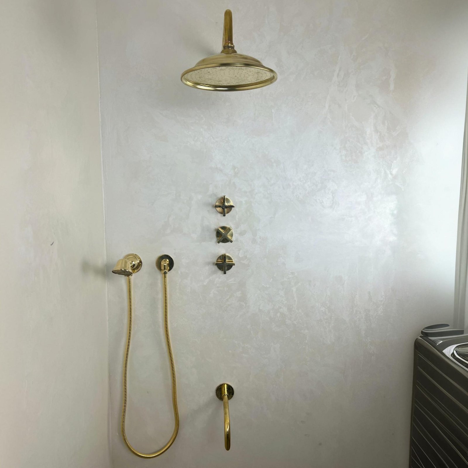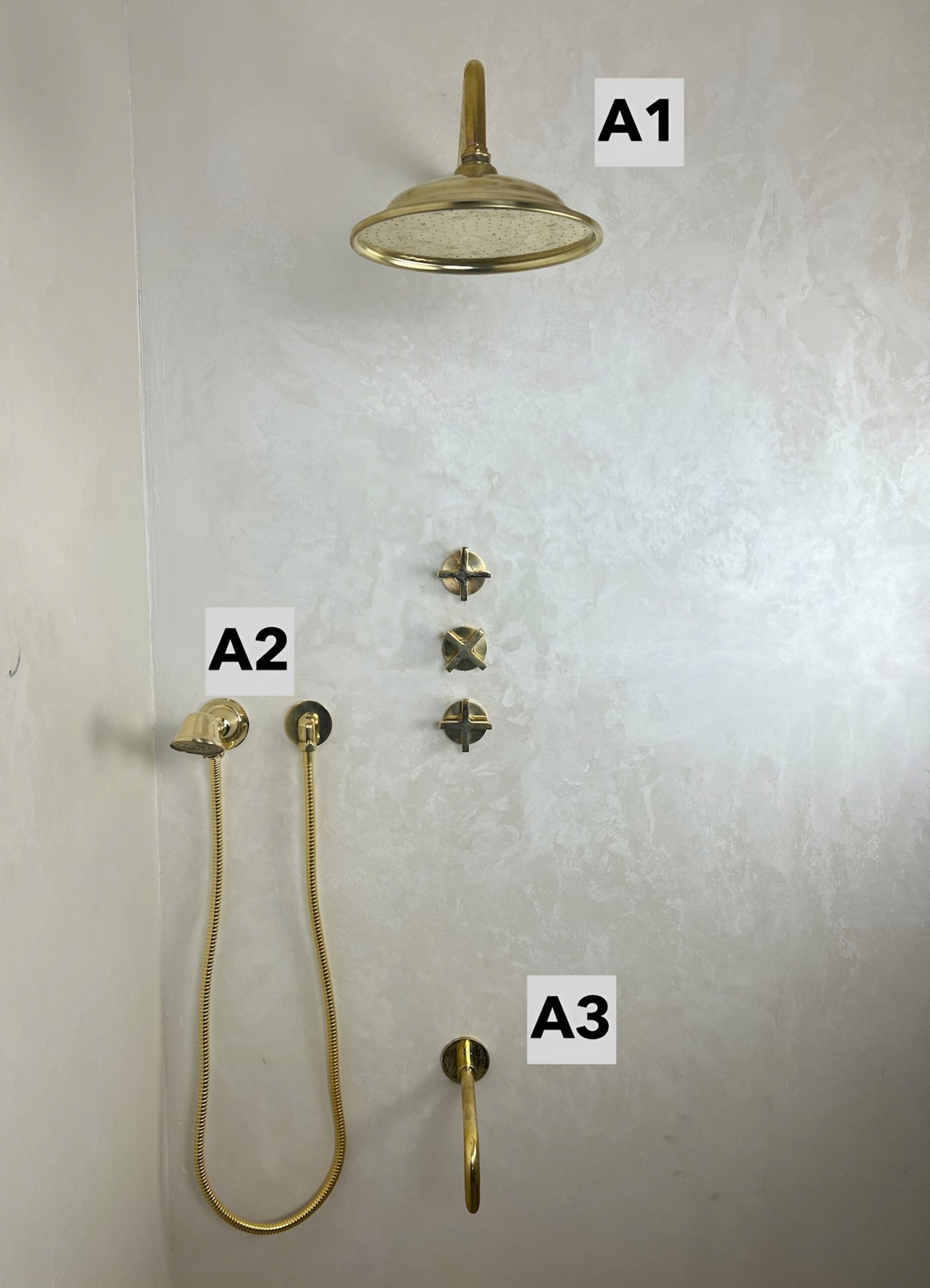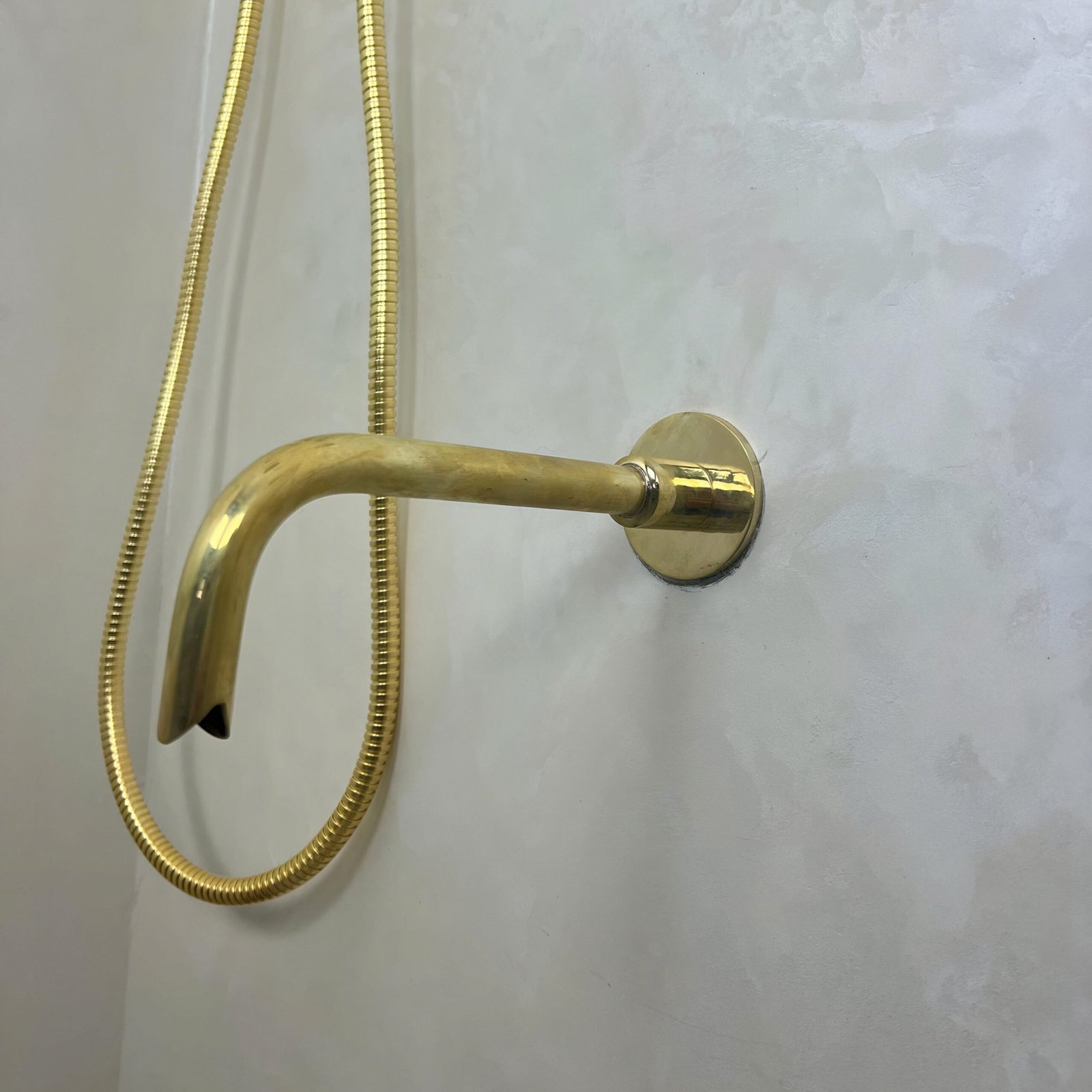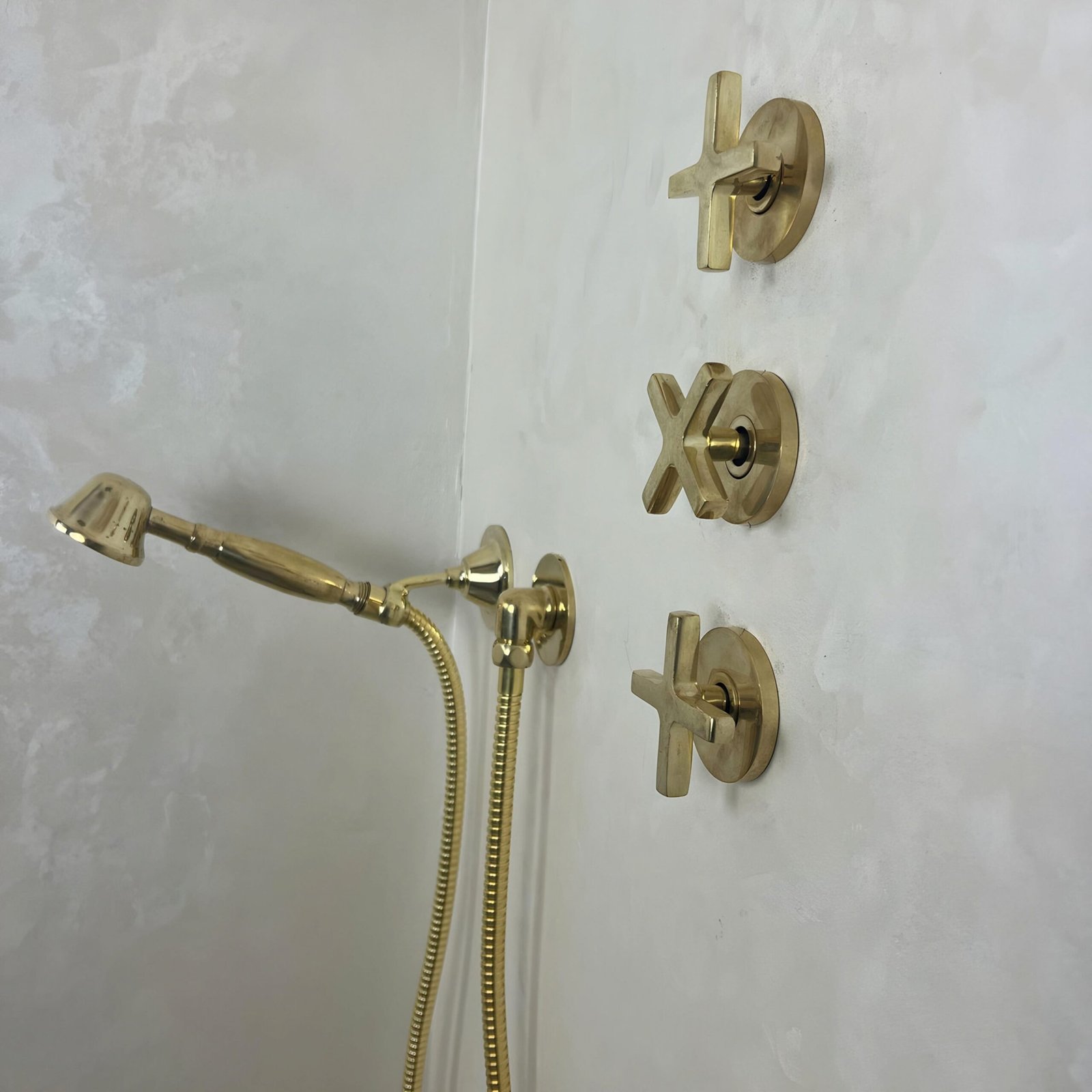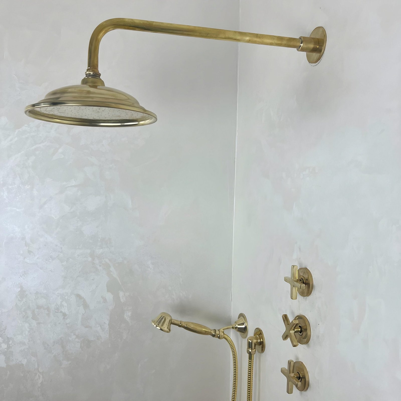 This unique unlacquered brass shower set includes three main components: a showerhead, a handheld shower, and a tub faucet. The showerhead features a classic, round shape with multiple nozzles for an even water distribution, creating a soothing shower experience. The handheld shower, which is attached to a flexible hose, offers additional convenience and flexibility, perfect for targeted cleaning or rinsing. It has an ergonomically designed handle and a matching round spray head. The tub faucet, designed to complement the other pieces, has a simple yet elegant spout.